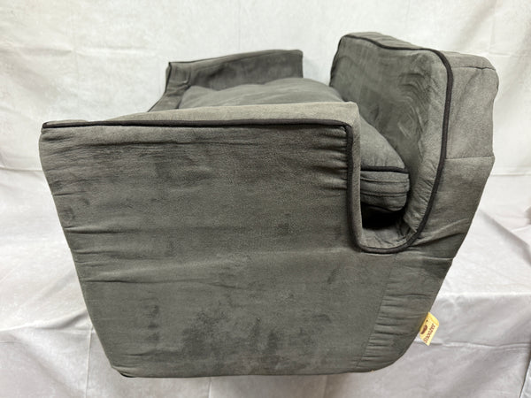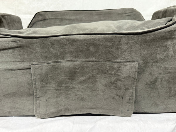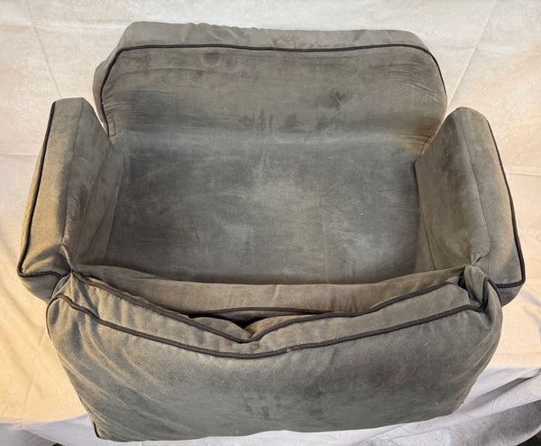 This pet car bed is a raised seat so they can look out the window. Covered in microsuede with a removable, washable cover, the seat has a built-in storage tray for accessories. Also comes with a connection strap for the seat belt to join the harness and secure your pet. Gently used with very little evidence of use. Retails new online for $226.
