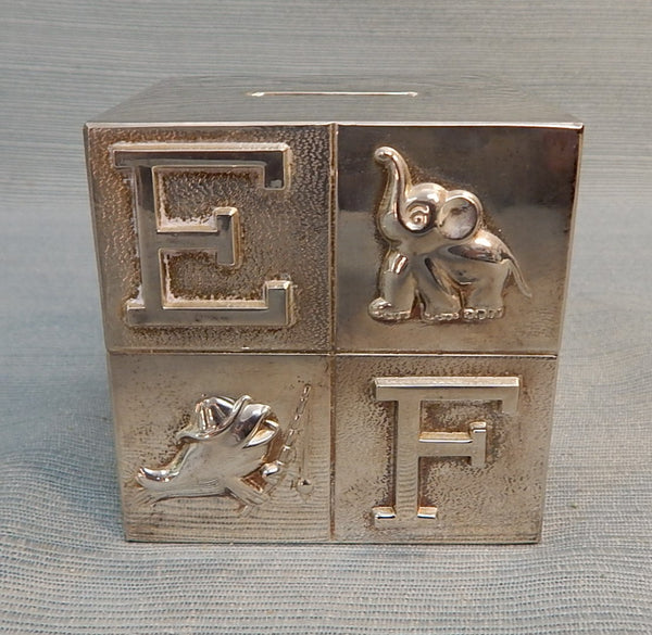 This silver plate coin bank is in the shape of baby blocks with the letters A through H illustrated with apple, bear, cat, etc. Very Good Condition; needs a little polishing.