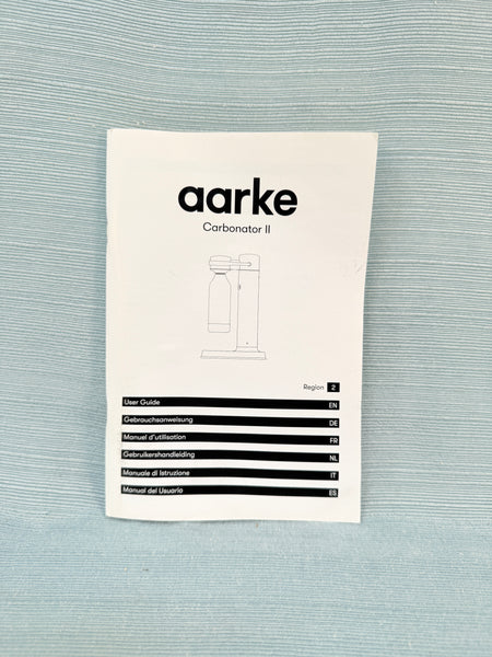 This Aarke sparkling water maker was designed in Sweden. The device has a simple lever mechanism - just fill the included bottle with cold water, screw it into the machine, push down the lever, then release. Add natural flavorings like citrus juice and syrups to create your own refreshing flavored, carbonated waters and sodas. Requires no electricity or batteries. Uses a CO2 cylinder (not included, available online) inserted into base. Comes with 2 BPA Free reusable containers with stainless steel lids. Comes with instruction booklet. Gently used, untested.