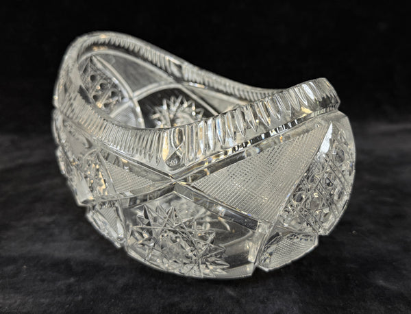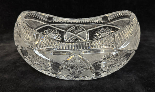 This crystal cut, boat-shaped glass bowl with starburst pattern. In Excellent condition with no chips, cracks or clouding.