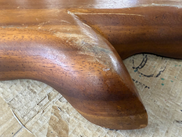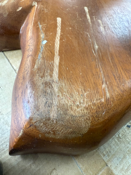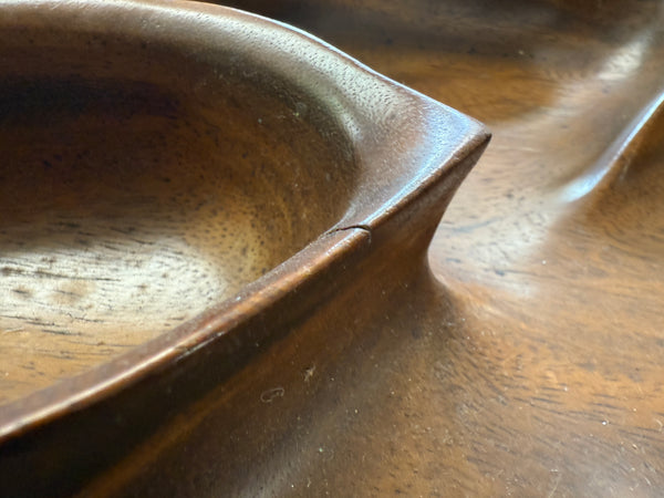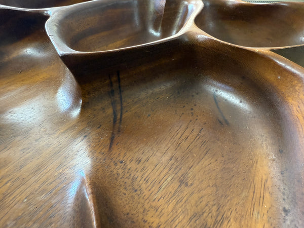 This large leaf-shaped serving tray is made in Honolulu, Hawaii of Monkey Pod wood, according to the inscription on the back. Different sized compartments allow for a variety of appetizers to be served.In Good Condition. There is a slight crack on the edge of the raised center compartment. And wear on edges and on back.