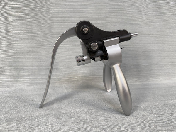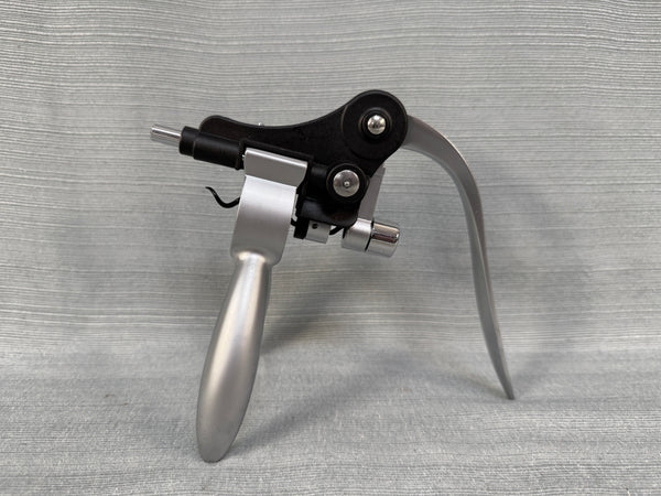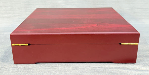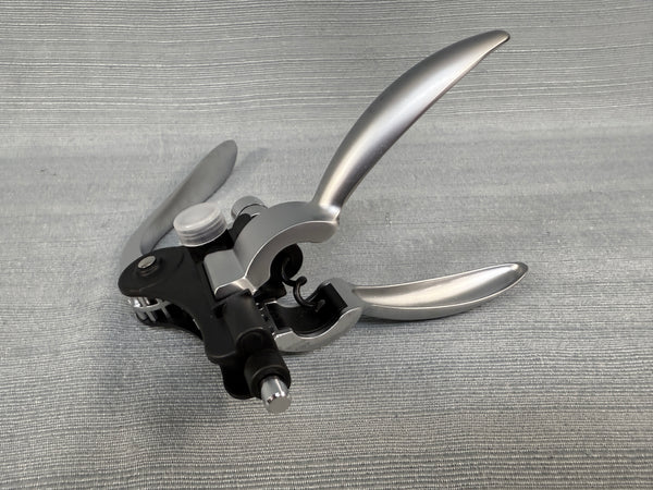 This Connoisseur Corkscrew Deluxe Set comes in a beautiful red wood tone box. The set includes a Rabbit-style wine bottle opener, wine pourer/stopper, drip ring, zinc alloy bottle stopper and an extra corkscrew attachment. The set originally has a foil cutter, but that is missing from this set. All items are in Excellent, like new, condition.