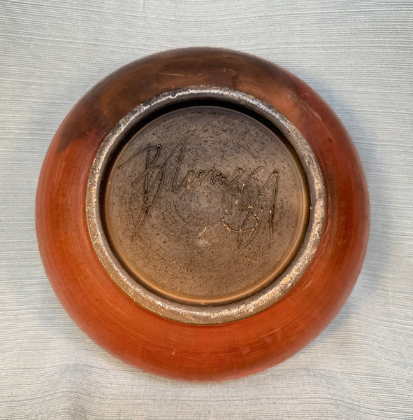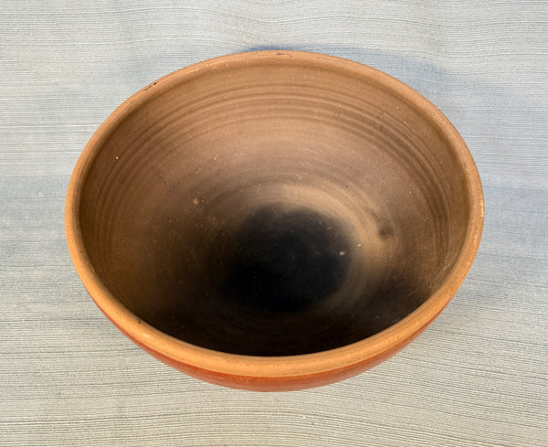 This large rustic bowl is glazed reddish-brown on the outside and unglazed inside. Signed Blume '81. It's in decent condition but has several small chips on the outside.