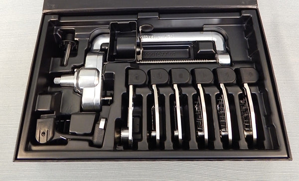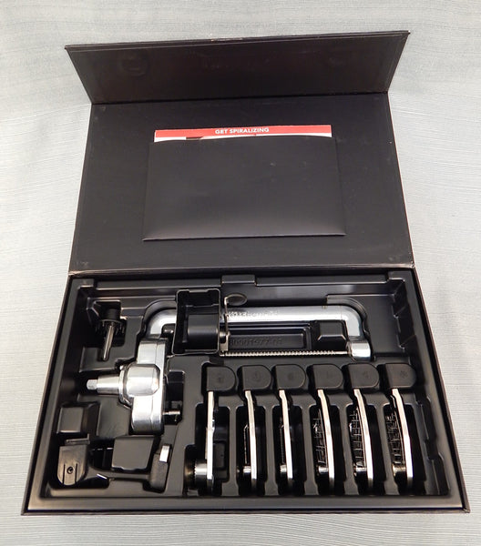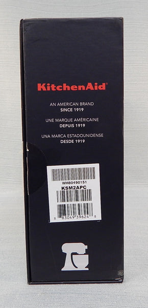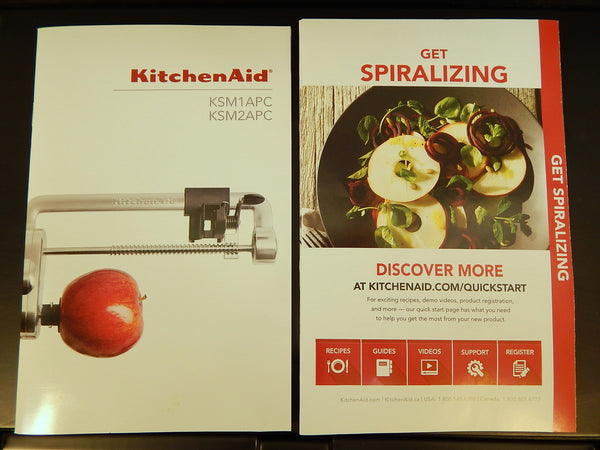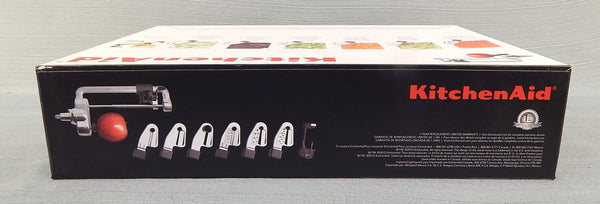 This KitchenAid stand mixer attachment set includes 7 unique blades, so you can employ your mixer to spiralize in 3 sizes, slice in 3 sizes and peel. Also includes a fruit/vegetable skewer. Works with all KitchenAid household stand mixers. Like new (looks like it was never used) in original box with instruction booklets.