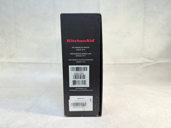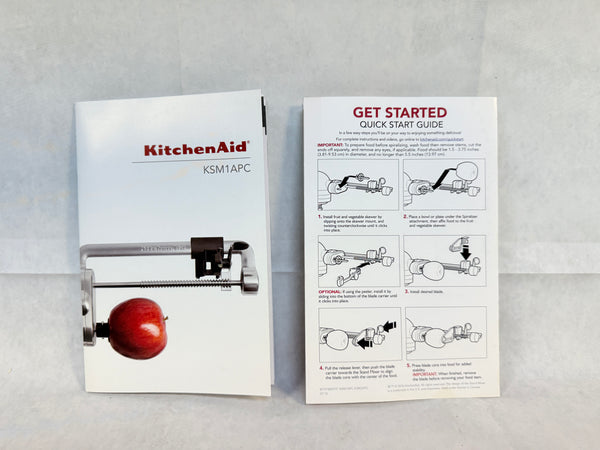 This set of accessories is complete in the original box and comes with instructions. According to the manufacturer, you can "Reinvent classic dishes with fress fruits and vegetables" It has two spiralizers, two spiral slicers and a peeler. Model Number KSM1APC.