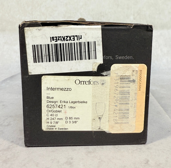 Intermezzo Balance from Orrefors was designed in 1984. The 30 cl (13.4 oz.) glass suits all kinds of wine. At almost 10" tall, the tulip shape bowl allows air to brings out the flavors and aromas. Mouth blown in Sweden by expert glassblowers and designed by Erika Lagerbielke. Brand New in box. Box has some wear and tear, but goblet is in Excellent Condition.