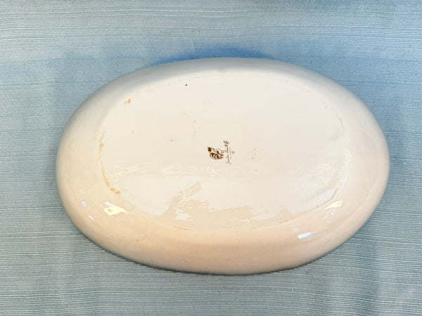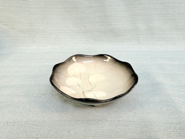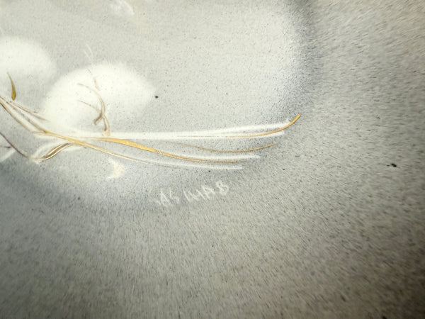 This is includes an attractive divided serving dish and bowls in gray ombré with silver and white dandelions. The serving dish is in Very Good Vintage Condition. Several of the bowls have tiny chips on the rims.