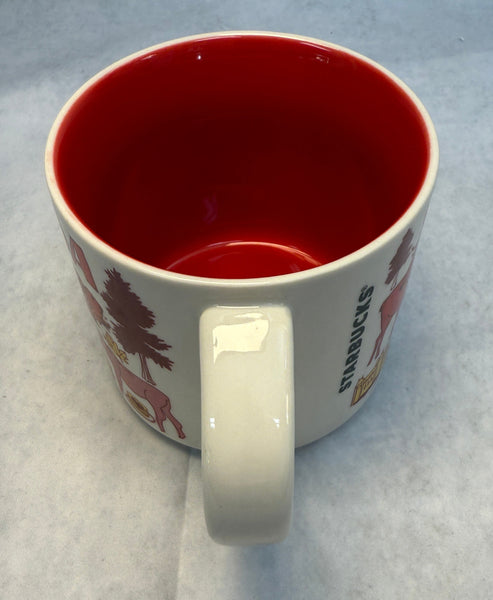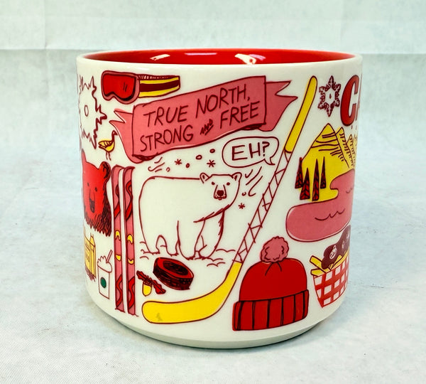 From the Starbucks Been There series, this 2019 white mug is covered in red and yellow images iconic to Canada - bear, hockey stick, maple syrup and more. 14 oz. capacity. The inside is red. In Excellent Condition.
