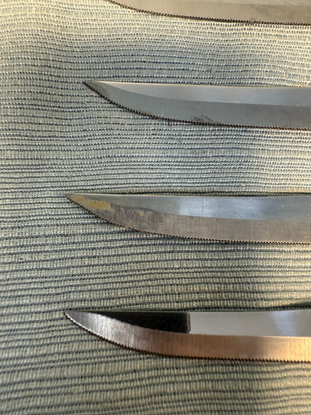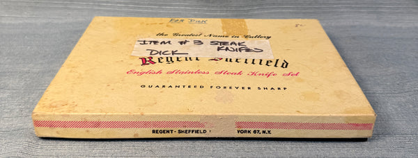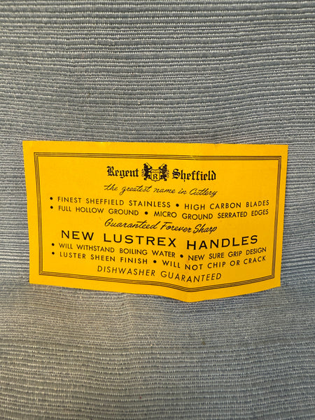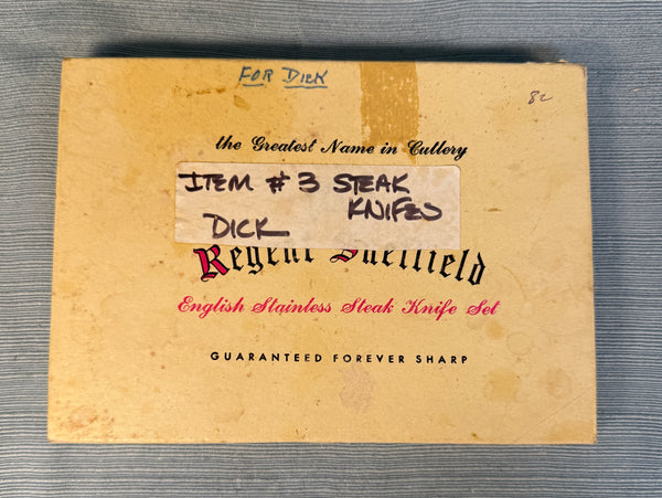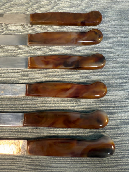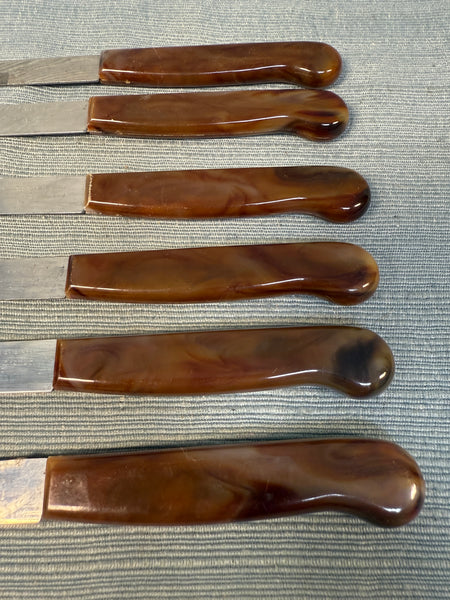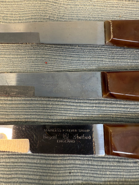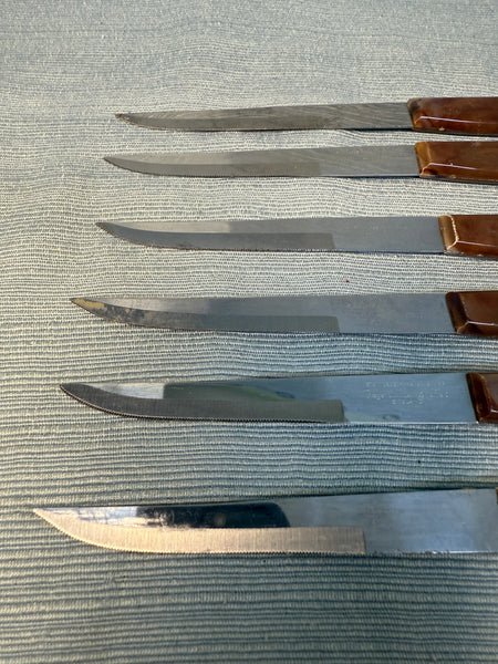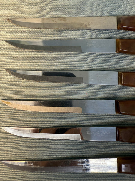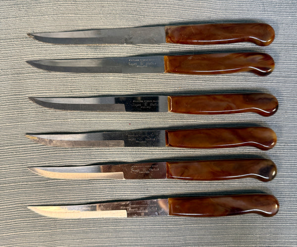 This boxed set of 6 serrated knives with brown bakelite-style handles comes in original box. Stainless steel blades, made in Sheffield, England. 8" long knives. Used, but in good condition with slight wear on edges of some handles (see photos) and blades need proper cleaning to sparkle, but are still sharp. Box has wear and tear.