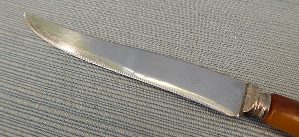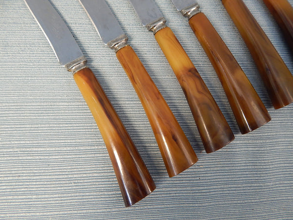 These 6 matching Westfield stainless steel 9" long knives have beautiful tortoise shell bakelite handles. All are in good condition.
