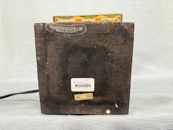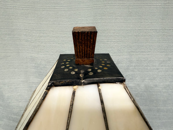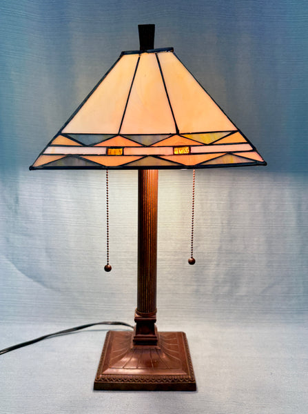 This stained glass shade table lamp has a craftsmen feel, and the 2 pull chains allow you to have either one or two bulbs illuminated. 10.5" square Tiffany Aztec design stained glass shade. Metal base and finial in brown "bronzed burl" finish. Contemporary manufacture with some very minor surface wear and leading on top of glass shade is slightly bent and separating (see close up photos.)