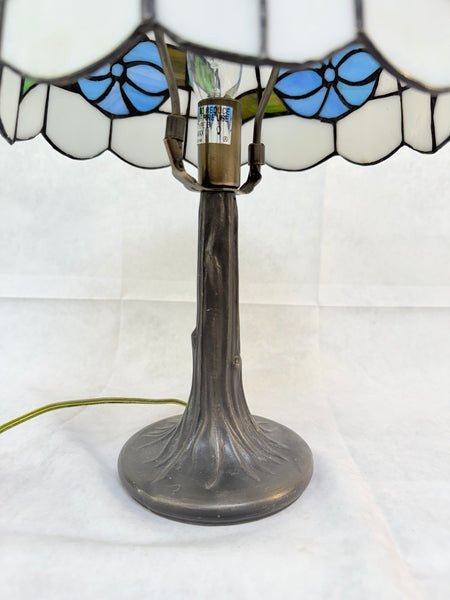 This contemporary Tiffany-style lamp has a shade of white with blue flowers and green and brown leaves. The metal base has a tree bark detail. Has a 6 ft. long power cord with toggle on/off switch. In Excellent working condition.