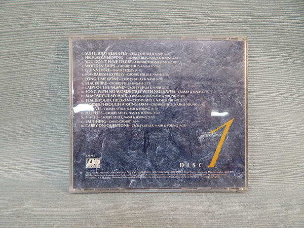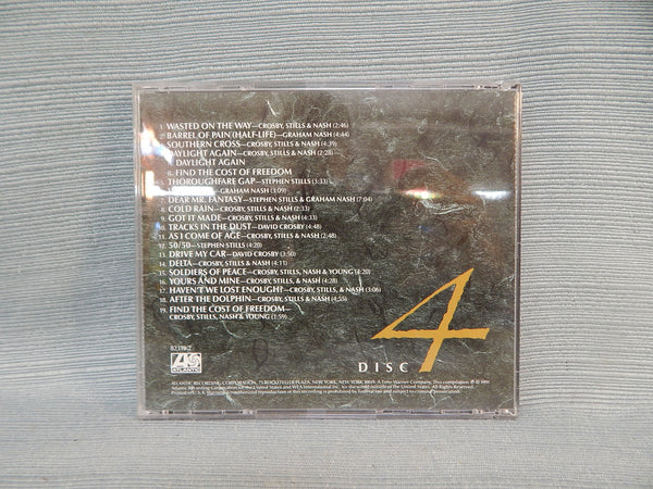 These 4 discs of music by Crosby, Stills and Nash are from a boxed set produced by Atlantic in 1991. The original box included a booklet, but that is missing from this set. These CDs feature demos, outtakes, as well as studio and live versions. This set provides a comprehensive and illuminating history of the band’s work. Artists on these recordings are Stephen Stills, Graham Nash, David Crosby, Neil Young, Branford Marsalis, Chris Hillman, Jimmy Page, Jimi Hendrix, Ray Barretto, Carole King, Jerry Garcia and Joni Mitchell. In Very Good used condition.