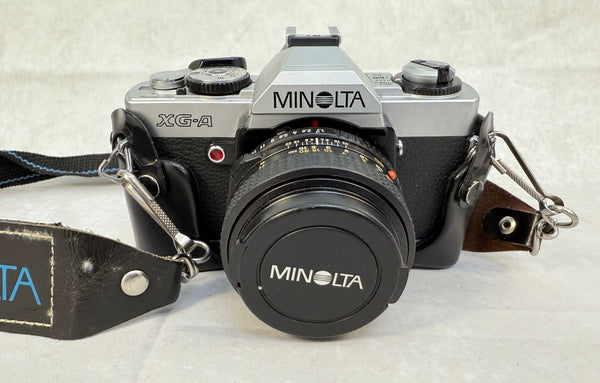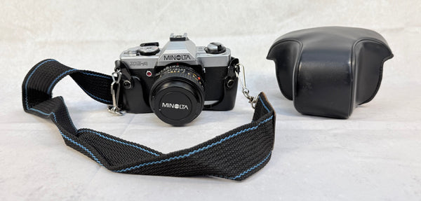 This camera has a 50mm 1:1.7 Minolta lens. It has semi-automatic exposure control and manual focusing with both prismatic and split focus in the viewfinder. Requires two pill-type batteries. It's in very good cosmetic condition but has not been tested.