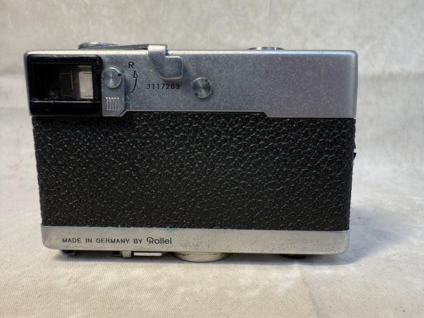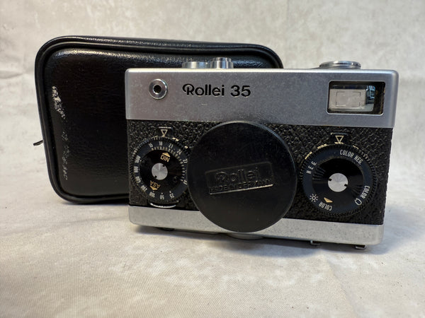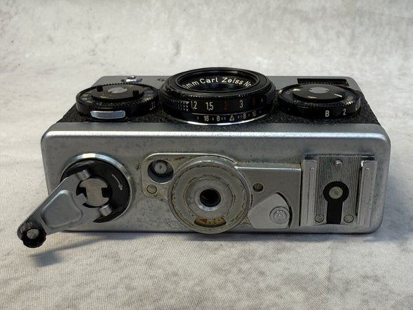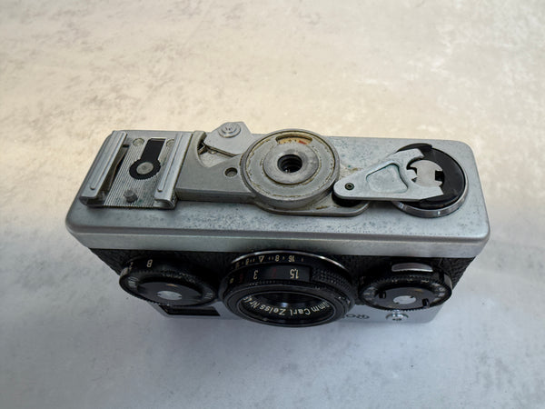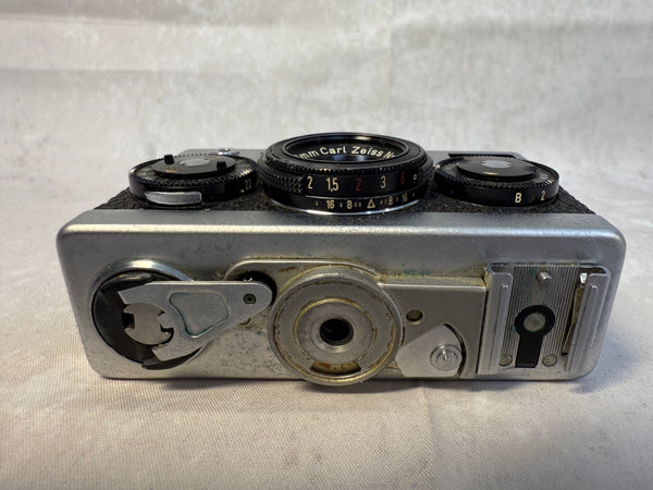 This compact 35mm camera is an impressive piece of German engineering. It has an f/3.5 Carl Zeiss Tessar 40mm lens. It's in very good cosmetic condition and is clean inside, but it has not been tested. Case and instructions are included. The case has a good bit of wear.