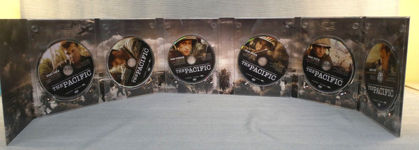 10 epidodes on 6 DVDs, this series presents a realistic portrait of WWII's Pacific Theatre as seen through the intertwined odysseys of three U.S. Marines: Robert Leckie, John Basilone and Eugene Sledge. These men and their fellow Marines clash with the Japanese all through the Pacific theater before returning home after V-J Day. Presented by Tom Hanks, Steven Spielberg and Gary Goetzman. In Very Good condition.