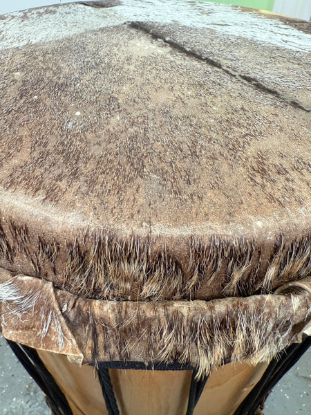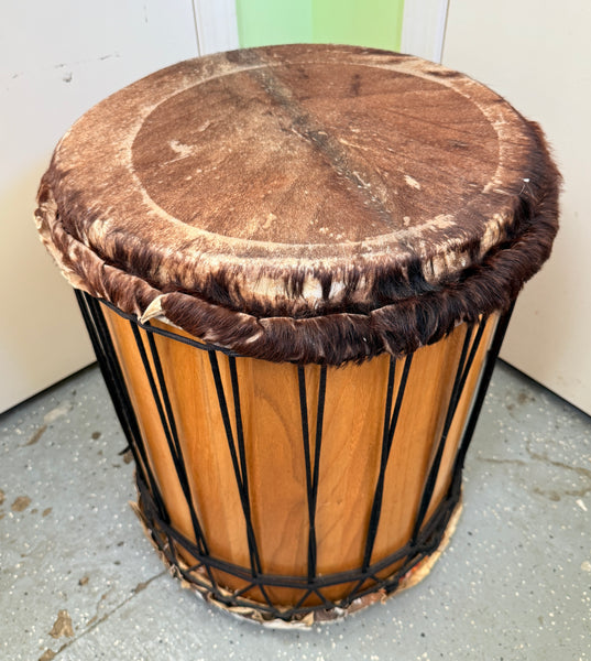 This drum was made by by local drum maker Tom Harris of Honey in the Heart. It's made of a lighter wood, possibly cherry, and has cowhide drumheads secured with black rope. It's in great shape and sounds good.