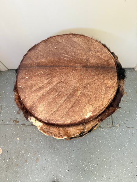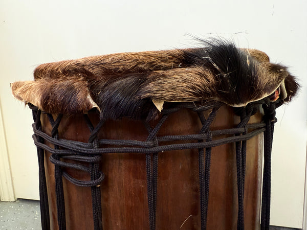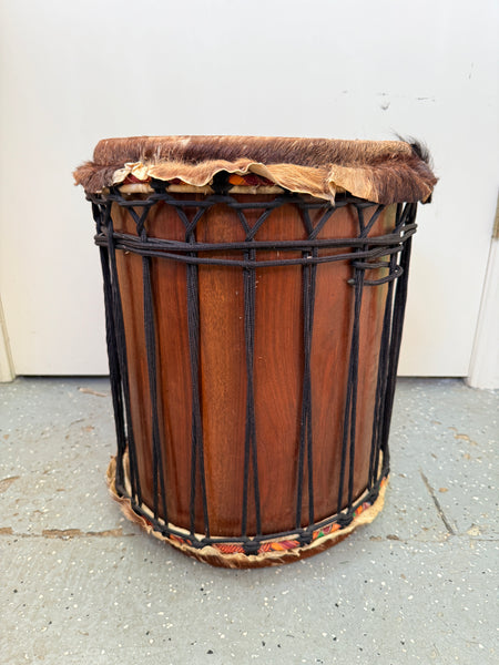 This drum was made by by local drum maker Tom Harris of Honey in the Heart. It's made of mahogany and has cowhide drumheads secured with black rope. It's in great shape and sounds good.