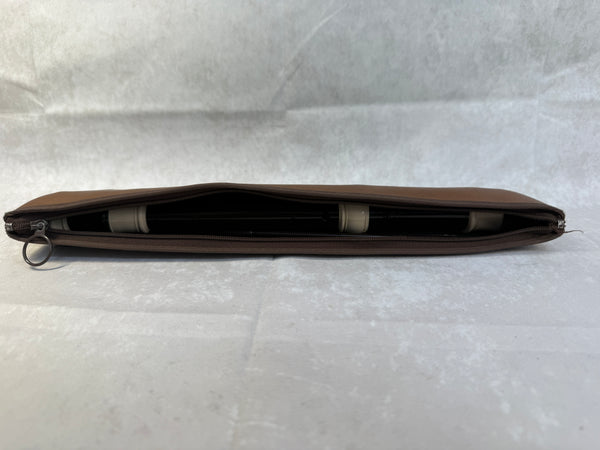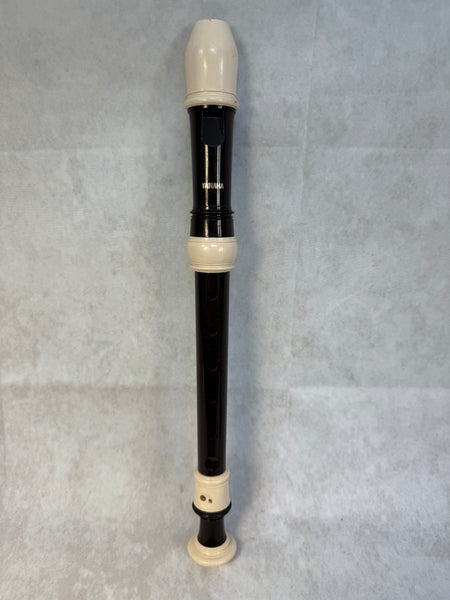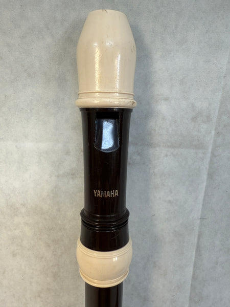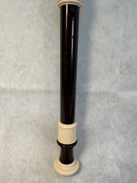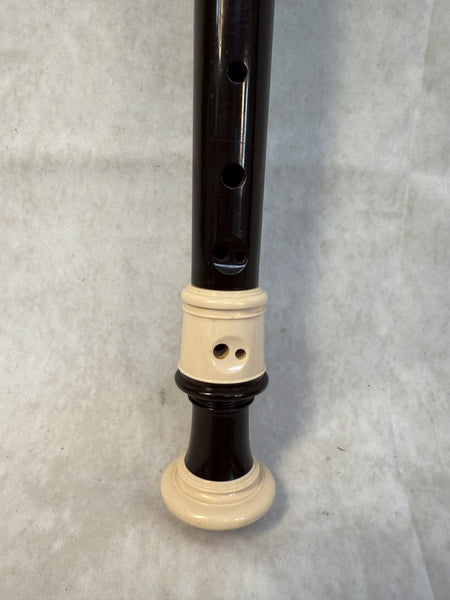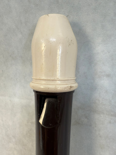 This recorder is black and cream plastic with a brown leather case and cleaning rod. It's clean and only has a slight bit of wear.