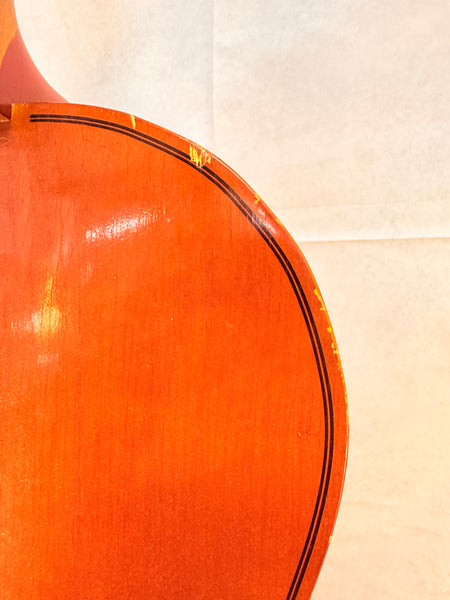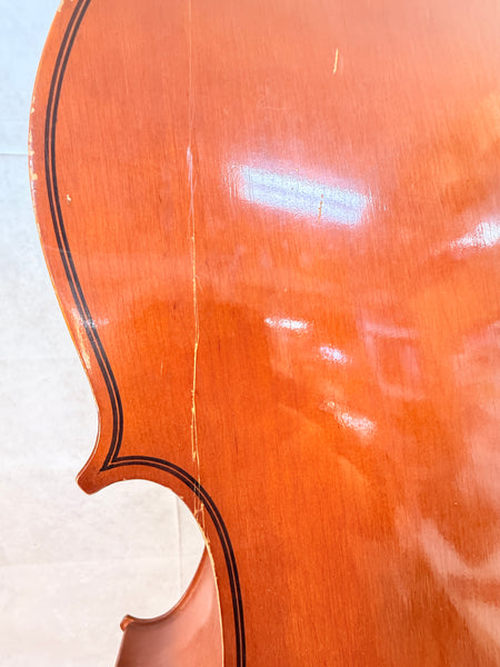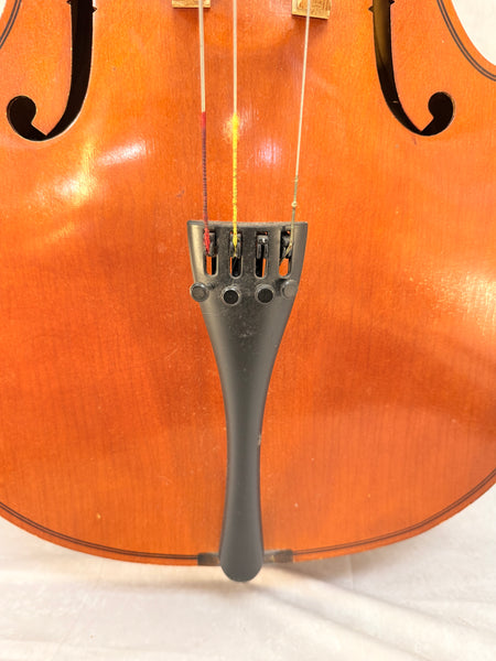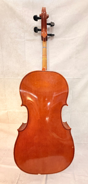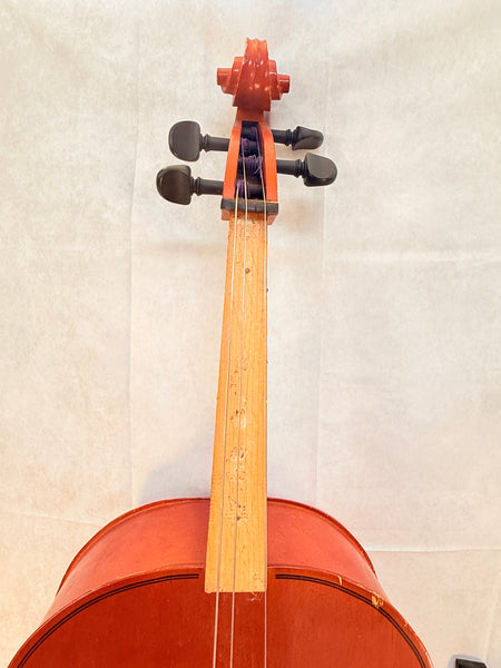 This cello is a copy of a 1719 Stradivarius, made in Cleveland in 1994. It's missing a string and the spike, the fingerboard is loose but intact, and the body needs some restoration work. No case or bow. Priced for Condition.