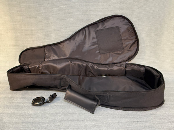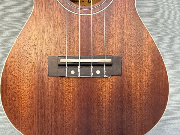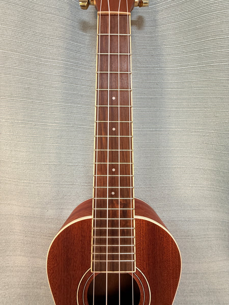 This Ukulele has a medium dark brown mahogany body with white banding and brass fittings. It's in Like New Condition and comes with a black nylon padded case. Made in Indonesia.