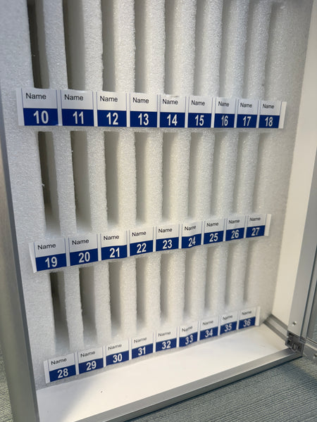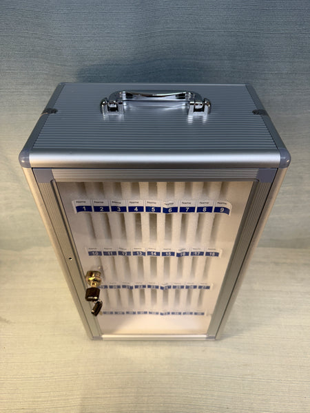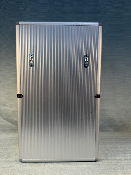 This wall-mounted, locking cabinet holds up to 36 cell phones. For use in Hotel, Factory, Employees, Office, Classroom, any situation. Lightweight construction, and has a handle for carrying. Comes with 2 keys. In Very Good condition with two scratches on back (see photos.) Retails new for $160 online.