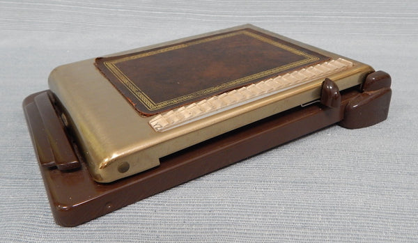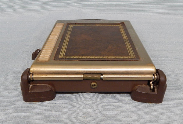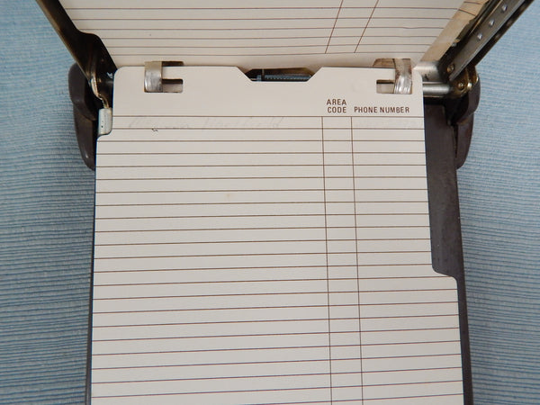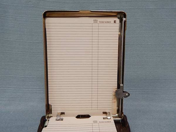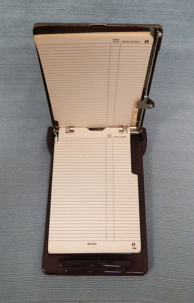 Back in the day, this old school device could be found in every home. The spring-loaded lid opens to the correct page, selected by a pointer on the side. The bottom portion is brown metal and the lid is brass with a leather insert. The pages are mostly clean, but some pages have had writing in pencil that has been partially erased. there's some wear on the brass. Good Vintage Condition.