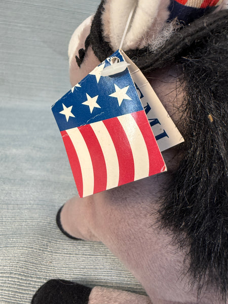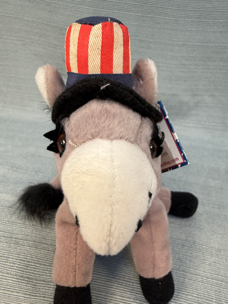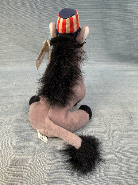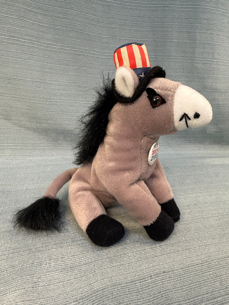 This plush donkey wears a red, white and blue hat and has a "Demi 2000" button on its chest. Campaign Promise #2": "I promise not to take you for a ride". Very Good Condition with original tag.