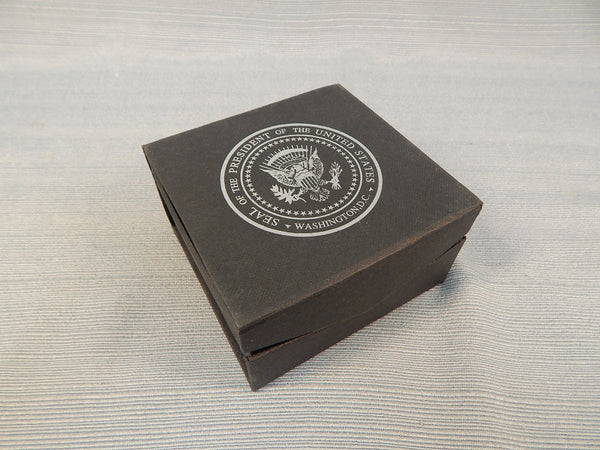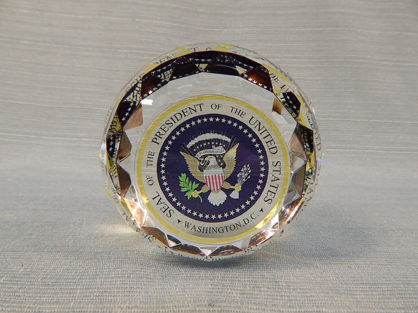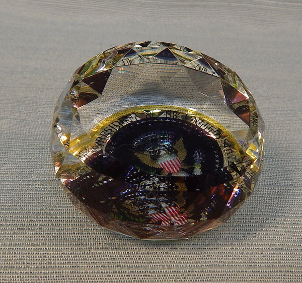 This handsome faceted glass paperweight bears the Presidential Seal. The top is slightly sloped. It's Brand New in the original box.