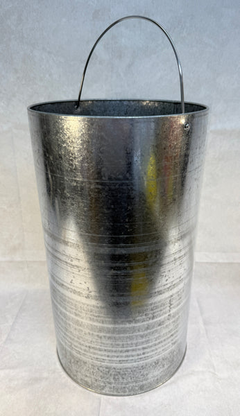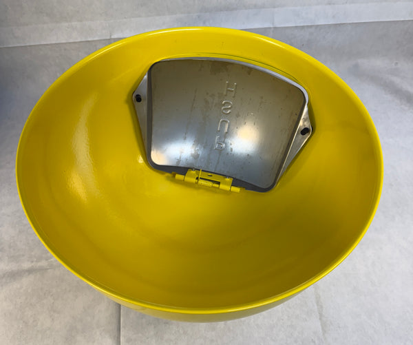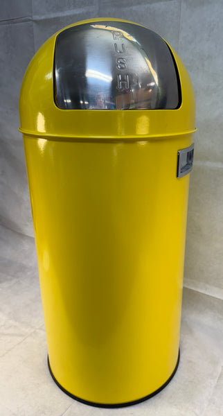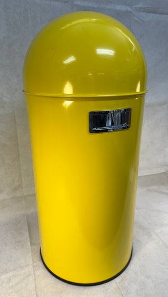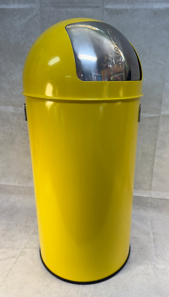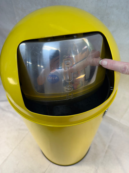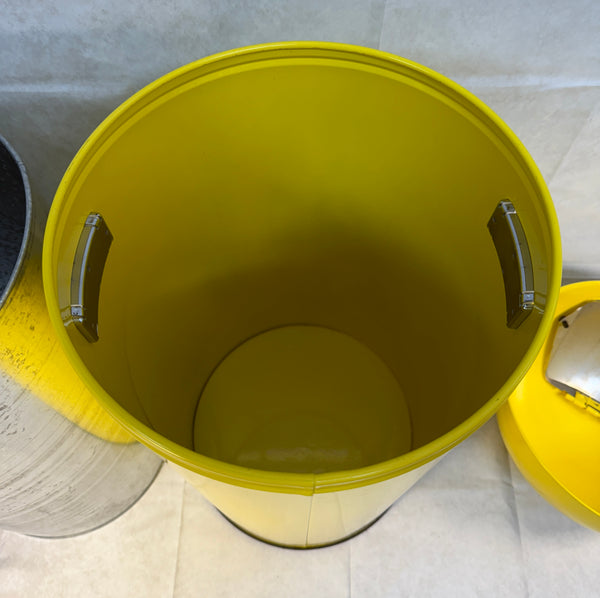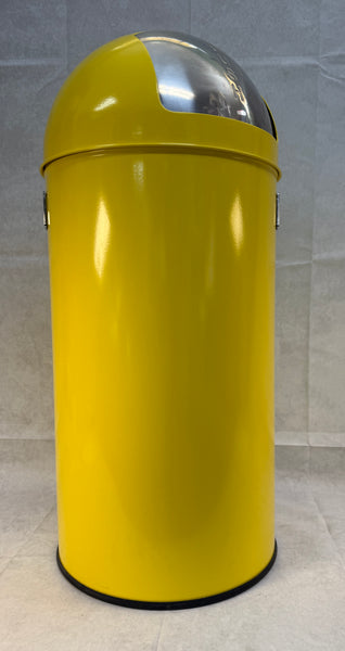 This bright yellow coated steel trash receptacle has a large push door opening and a removable galvanized steel liner with handle. In gently, used condition with a few very small surface scuffs. Similar bins retail for over $150 online.