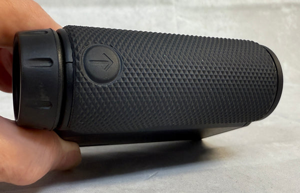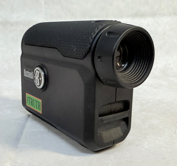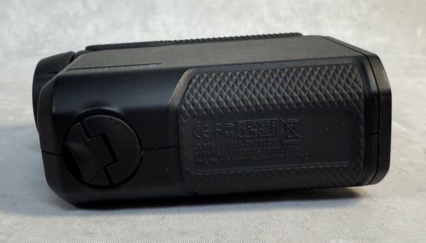 This compact monocular rangefinder has a readout of distance in yards as well as ARC (Angle Range Compensation). It has 4x magnification and a range of 7 to 850 yards. No case is included. It's in Very Good Condition and has a CR2 battery.