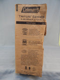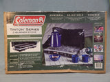 This stove has been used and needs cleaning of the burner area, but all the parts are there and the exterior of the stove is nice and shiny black. It has two 11,000 BTU burners and folding windscreens. Comes with a valve for a propane cylinder.