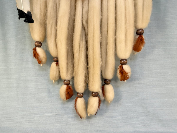 This large mandella is handmade and symbolizes the shield of luck. The Indians believed that having one in their home would bring them prosperity, good health and happiness. It is made from natural sheep's wool. rabbit fur, leather, wood, pheasant and turkey feathers, beads and conchos.