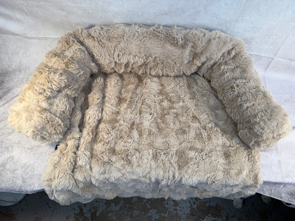 Made of soft faux fur-like OEKO-TEX certified fabric (free from harmful substances; irresistibly soft texture invites burrowing and nesting; safe for sensitive skin and allergy-prone dogs). Raised back and side bolsters allow your pet to rest their head and feel safe. Draping fabric helps protect your furniture from fur, dirt and scratches. Spill-resistant surface, and removable cover unzips and machine washes at 30 degrees; air dry to preserve plush texture and shape. Size M/L, Beige, Like New!