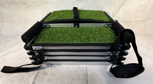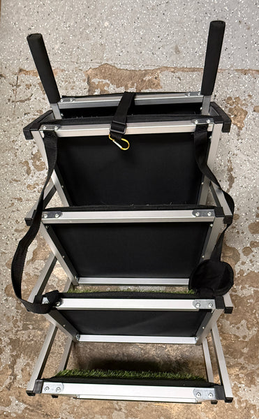 With a 26" to 48" adjustable rise, this portable, 5-step folding dog stair can be used for cars, SUV, trucks or indoor high beds, etc. Easy to set up and take down, it folds into a compact size. At just under 11 lbs., it is still sturdy enough to withstand 150-200 pound large dogs, according to the manufacturer. Has faux grass, non-slip steps and hand straps. Used, but Excellent condition. Retails online for over $220.