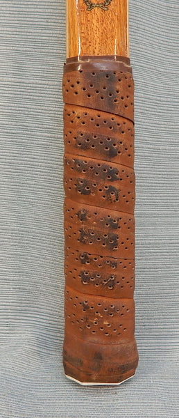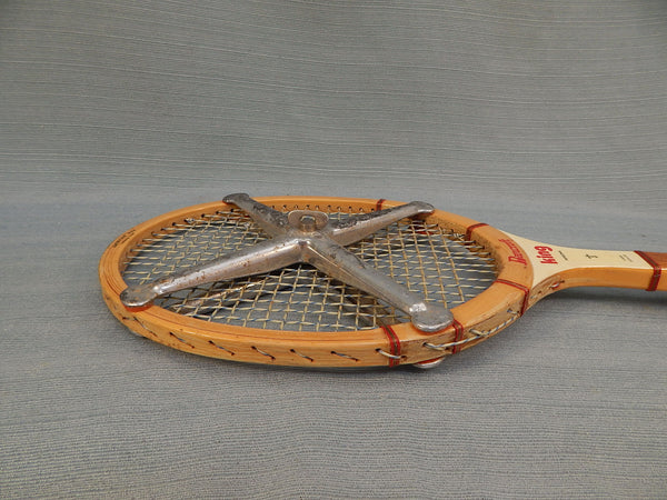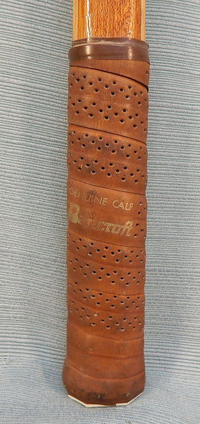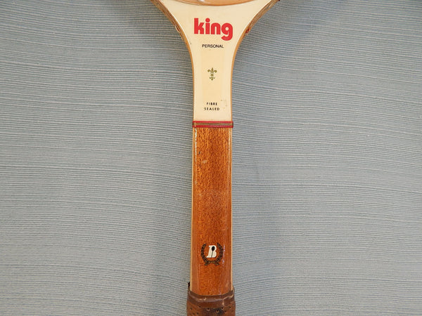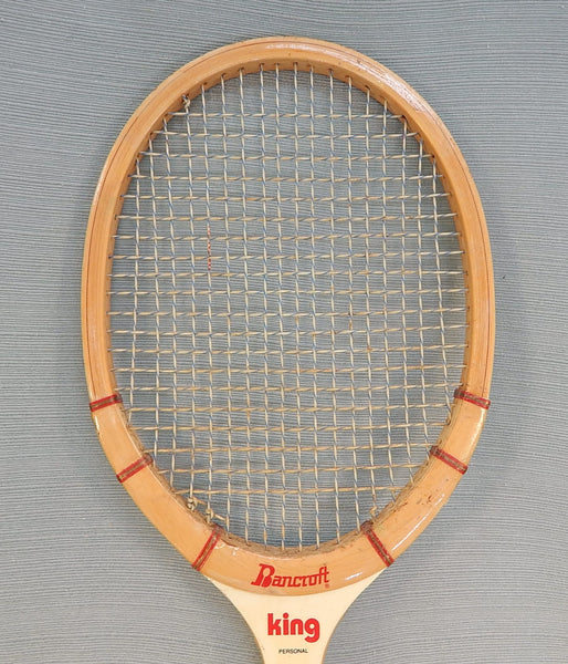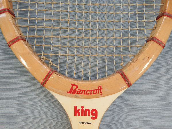 This 1970s Bancroft tennis racket is a Billie Jean King model. This King Personal racket comes with original metal brace. Registration # K5450, comes with original grip and strings. Decal on side reads "used by Billie Jean King in Tournament Play". Used, with surface scratches around outside edge of the American Ash laminated frame. Some surface dirt on the inside edge of the frame which can be scrubbed off.