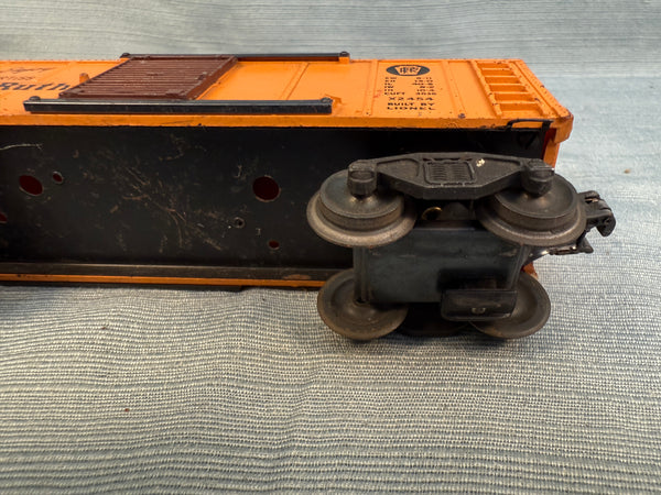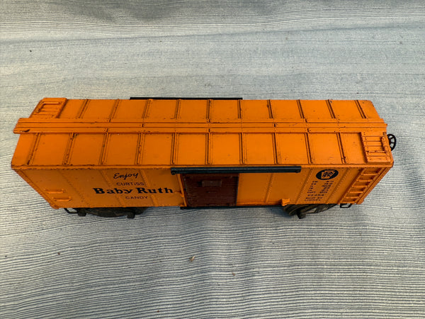 This vintage model railroad box car was made by Lionel. It is yellow with brown sliding doors on each side. Enjoy Curtiss Baby Ruth Candy graphic on both sides. Box car X2454. Has some light scratches, dust and light rust, but in overall good condition.