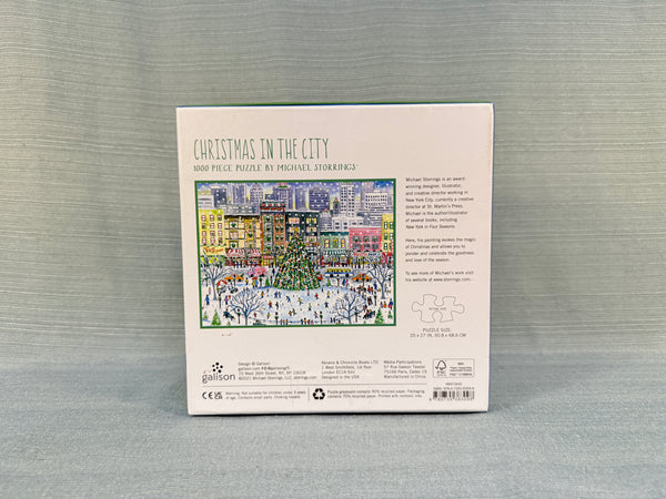 Produced by Galison, this 1000 piece jigsaw puzzle features a colorful illustration by Michael Storrings of Christmas in a city. Completed size is 20" x 27". Used, but certified complete by a member of our staff.