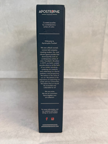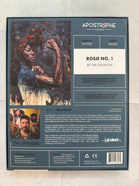 This Apostrophe Jigsaw Puzzle assembles to 26" x 19". Tim Okamura is a Brooklyn-based artist. His interpretation of Rosie the Riveter has an African-American woman showing her muscle. Used, but certified complete by a member of staff.