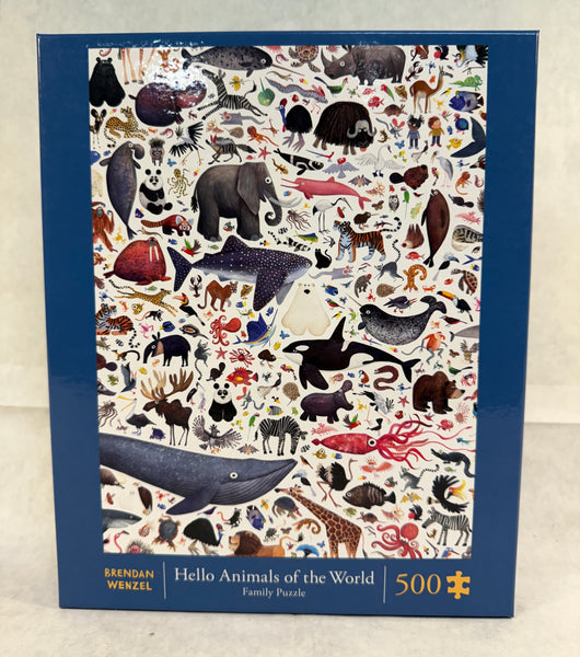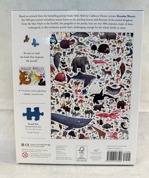 500 piece jigsaw puzzle by Chronicle Books. Features a colorful collage of sea and land creatures from the book Hello Hello by Brendan Wenzel. Completed dimensions are 18" w x 24" h. Used, but certified complete by a member of our staff.