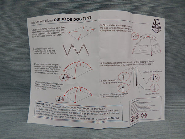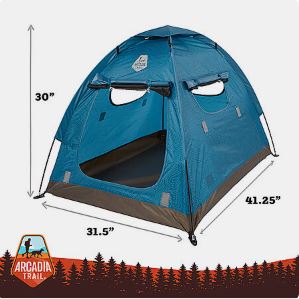Check out this Pup Tent! Opens to 41.25" d x 31.5" w x 30" h, it is a waterproof, fire resistant, UV protection space for you pet. Even has a front awning for shade. Collapses and packs into a 19" w x 7" h x 2" d carrying case. This turquoise tent is brand new with tages and instructions.