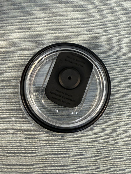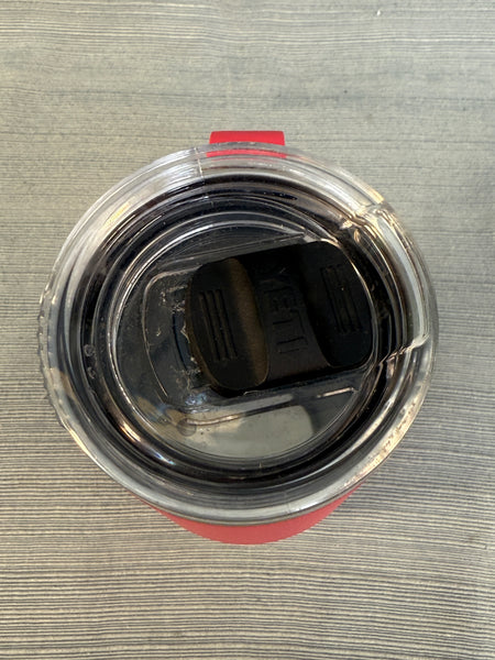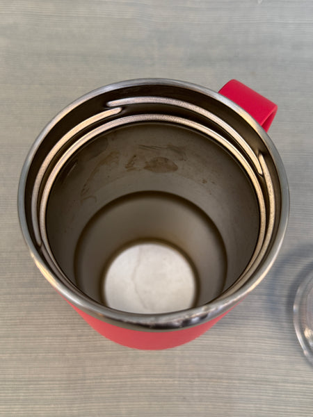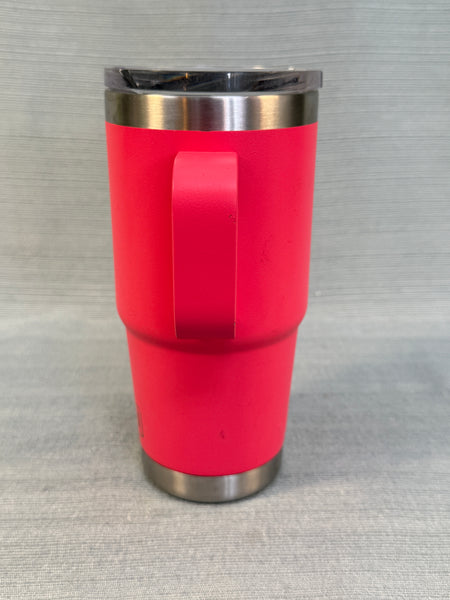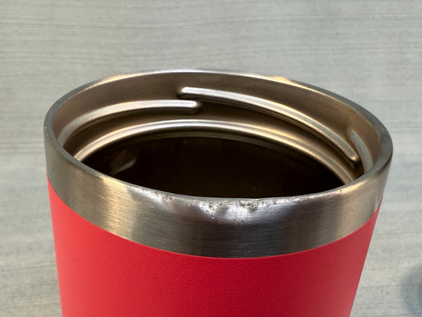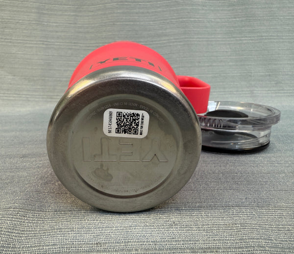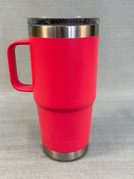 This pink travel mug is in good shape, but there's a dent in the rim that will not affect its use. The lid and inside also need cleaning. Like all Yeti products, it will keep beverages hot or cold for a long time.