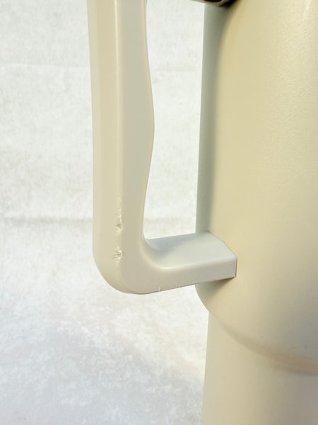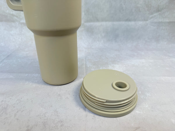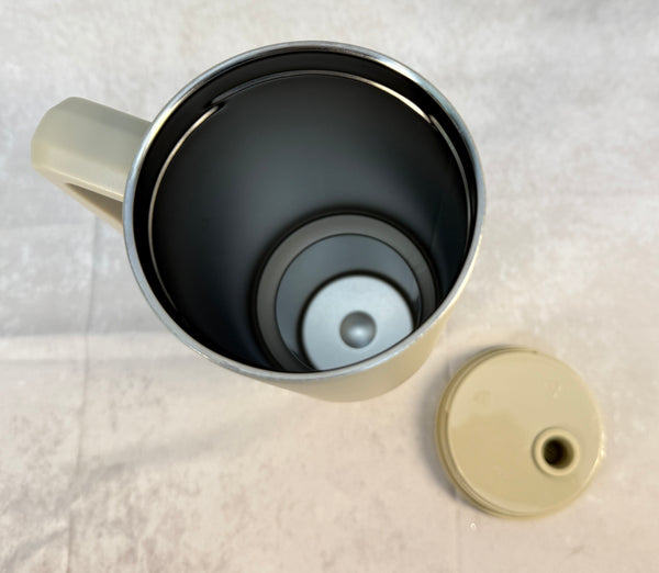 Tapered shape with handle, leak-resistant insulated lid, sweat-free exterior with double wall insulation. BPA and Phthalate free material. Tumbler and lid are dishwasher safe, according to manufacturer. In Good condition with a few small edge dings and a dent on the bottom edge (see photos.) Priced accordingly.