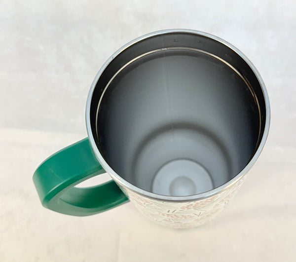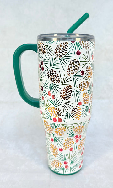 Adorned with pine cones and holly berries, this large travel mug keeps cold drinks cold for 24 hours and hot drinks hot for 9 hours with triple-insulated, copper-plated, stainless steel body. Holds up to 40 oz of beverages. Comes with a matching straw with silicone flexi-tip, a BPA free, extra large cup lid and a built-in silicone coaster base that prevents slips, drips, and scratches. Dishwasher safe, according to manufacturer. In good, used condition.