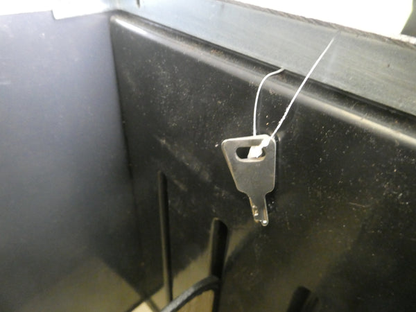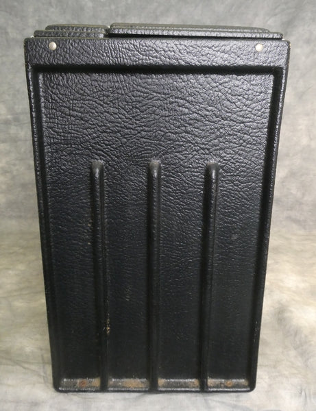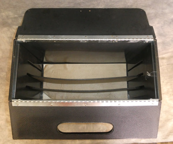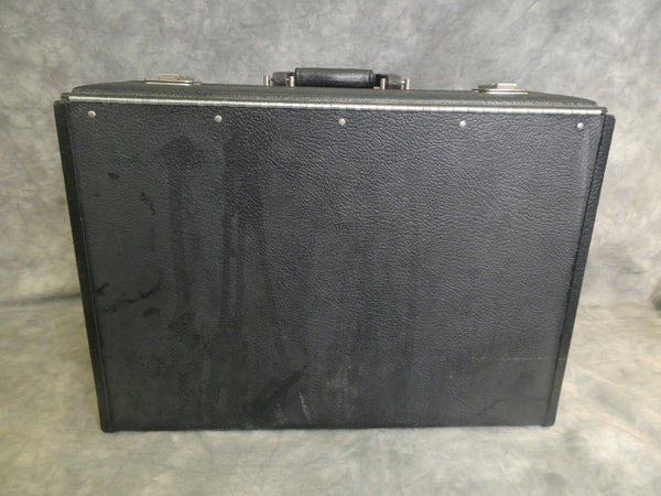 This black molded plastic case has 2 adjustable dividers inside. It comes with 2 original keys. In Very Good condition, but needs some cleaning and has some spots of rust on bottom rivets.