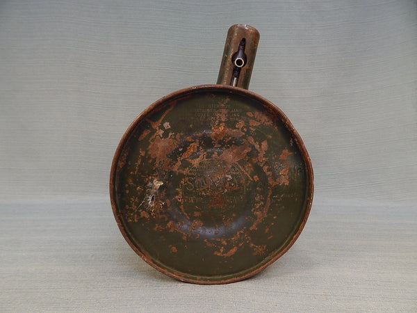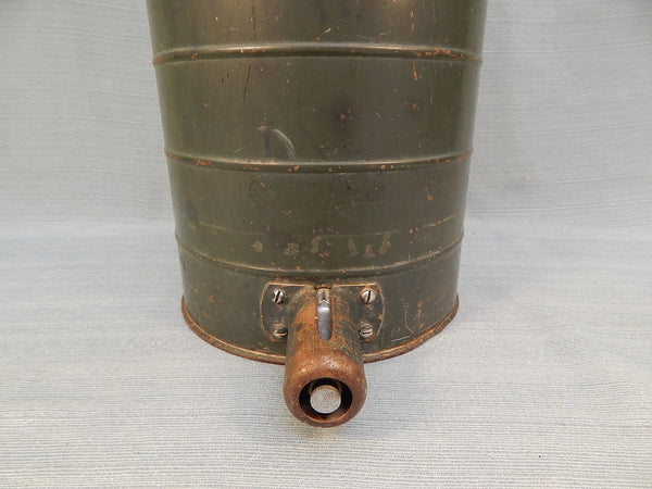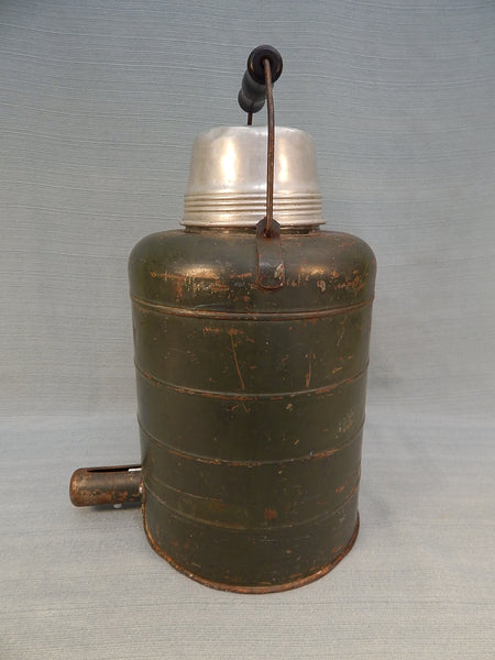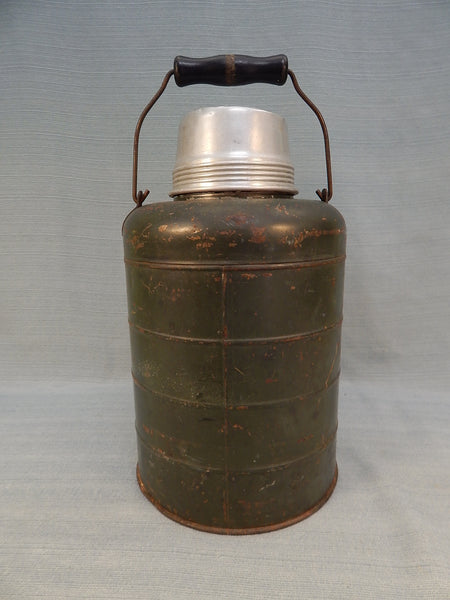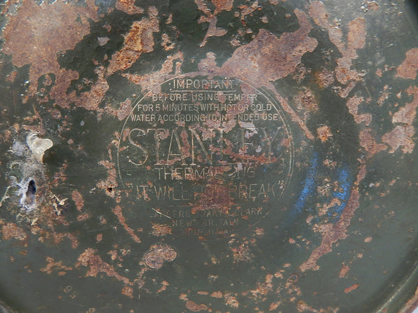This vintage Stanley Thermal jug is marked on the base "To Sterilize, fill container with and wash cover in boiling water. Let stand 5 minutes and pour out." Also, "Stanley Thermos Jug. Landers, Frary & Clark New Britain, Conn. USA". Produced in the 1940s, this style of thermos was used on airplanes during World War II so air crews had access to hot water for coffee, soup, etc. Has some rust spots and it is rusty inside, as well.