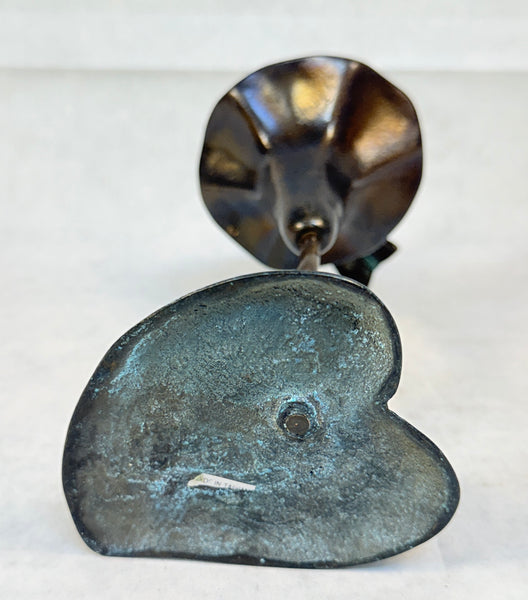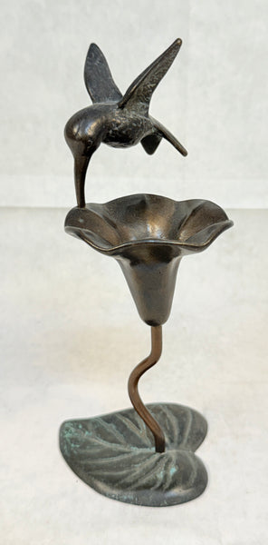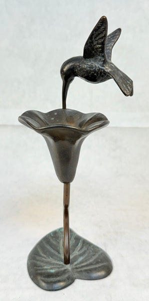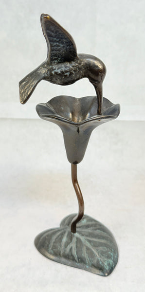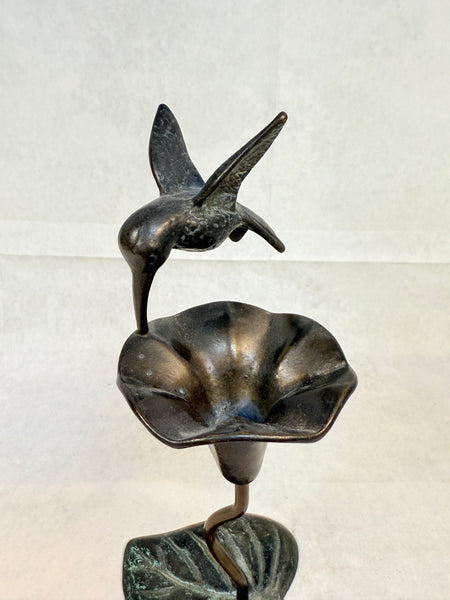 This bronze figurine is a hummingbird landing on a trumpet vine flower. Very Good Vintage Condition.