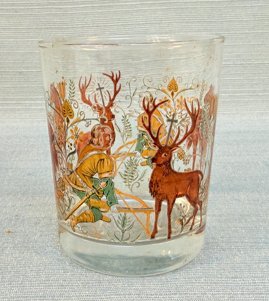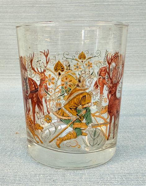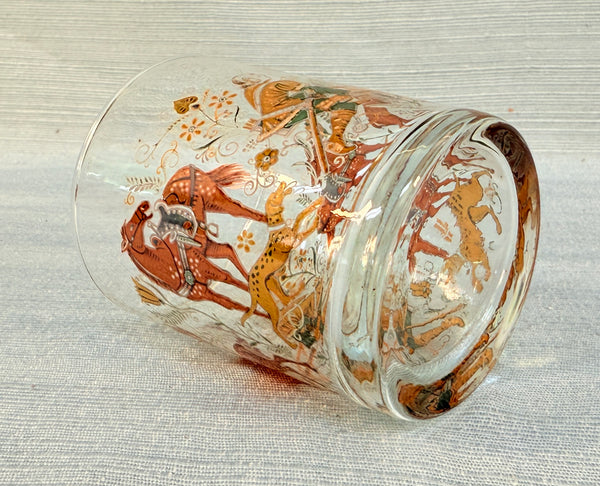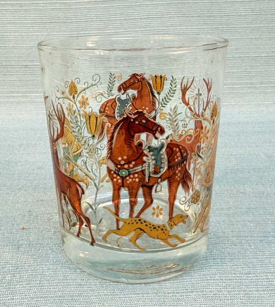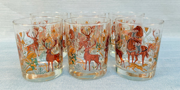 These mid-century glasses by Cera are lavishly decorated with an image of St. Hubert dismounted from his horse and bowing down to a miraculous stag. Very Good Vintage Condition in the original box. Hand wash only.