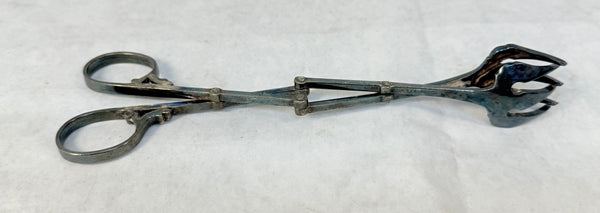 These clever tongs have an articulated scissor design that allow for you to easily pick up an ice cube or sugar cube. Made in Italy. They are in good condition but need polishing. In the original box.