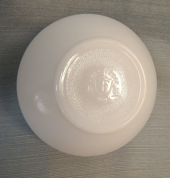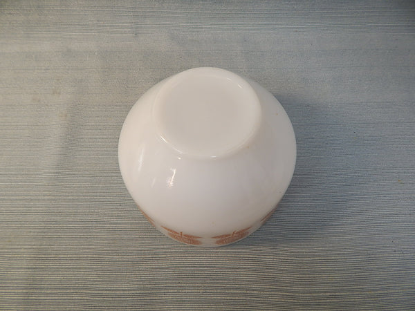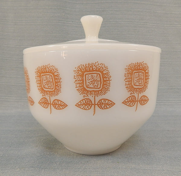 This 1.5 quart milk glass bowl is patterned with mid-century modern sunflowers in reddish-brown. It's in Mint Condition. Best to hand wash to preserve the pattern.